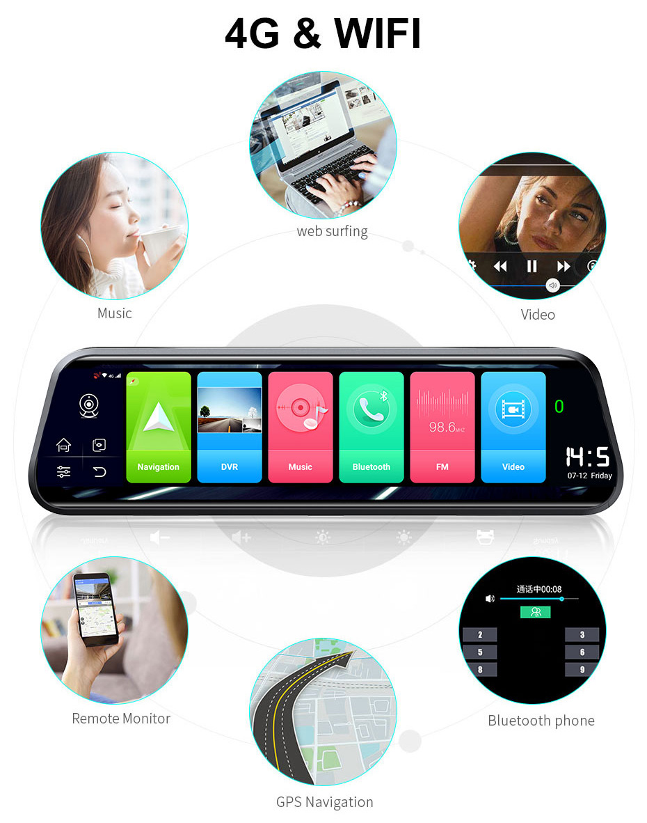 Встроенный полноценный модуль Bluetooth, после соединения с мобильным телефоном, поддерживает телефонные звонки на автомобильном зеркале или передавать музыку с мобильного телефона.